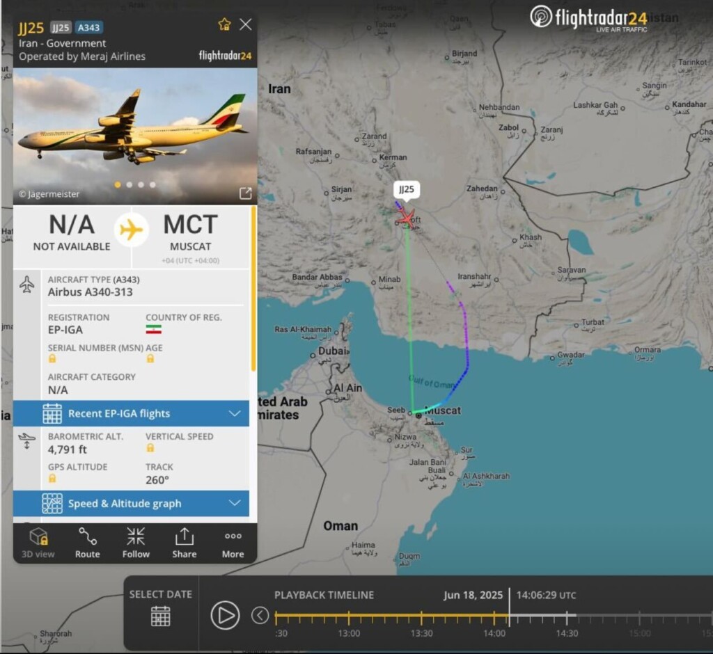 در میانهی فضای پرتنش منطقهای و تشدید فشارهای امنیتی در داخل ایران، یک فروند هواپیمای ایرباس A340-313 متعلق به دولت جمهوری اسلامی ایران، چهار شنبه ۱۸ جون ۲۰۲۵، تهران را به مقصد مسقط، پایتخت عمان ترک کرد.