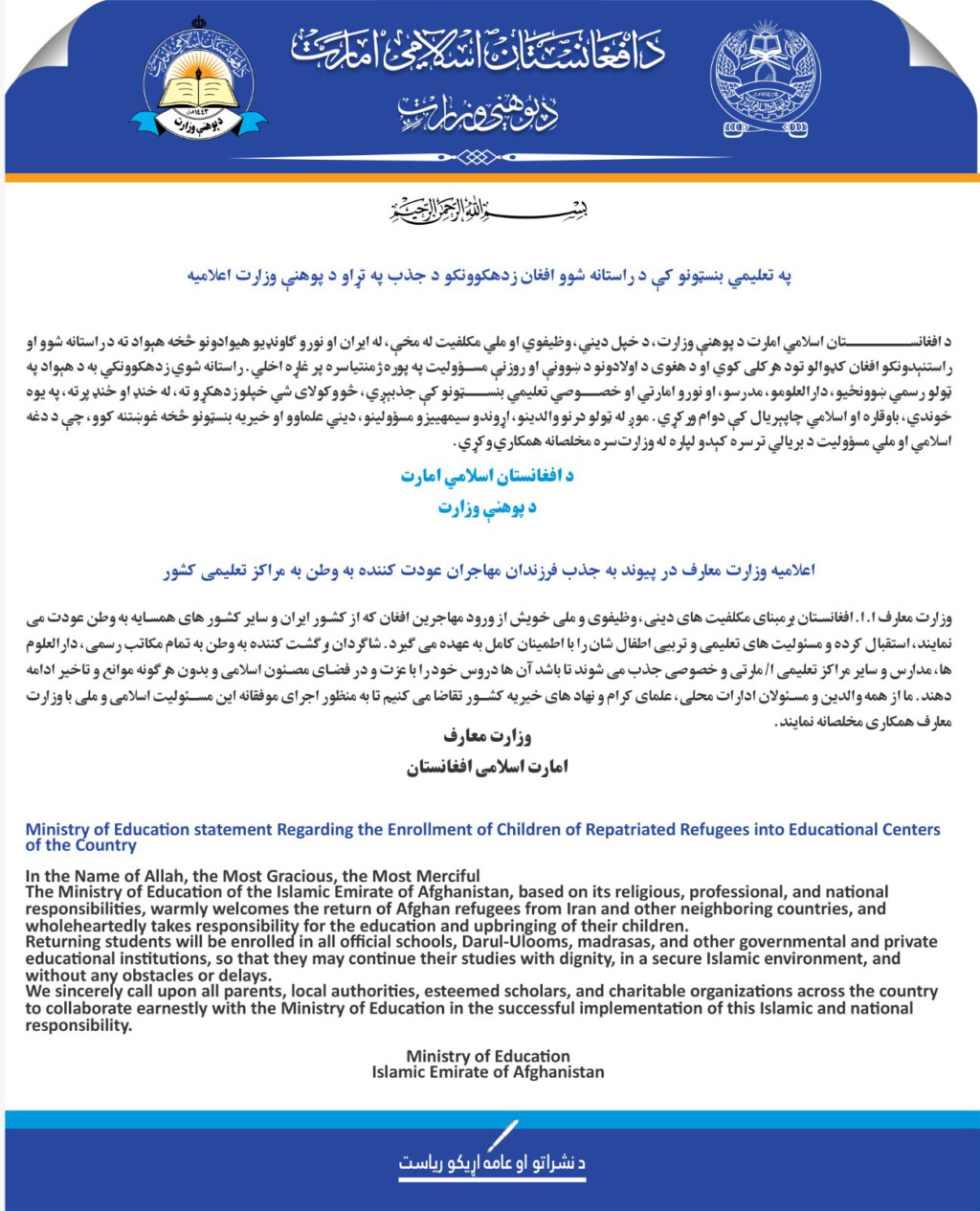وزارت معارف افزوده است که بر اساس تعهدات دینی، وظیفه ملی و مسوولیتهای اداری، از جذب هموطنانی که از ایران و دیگر کشورهای همسایه بازمیگردند، استقبال میکند.