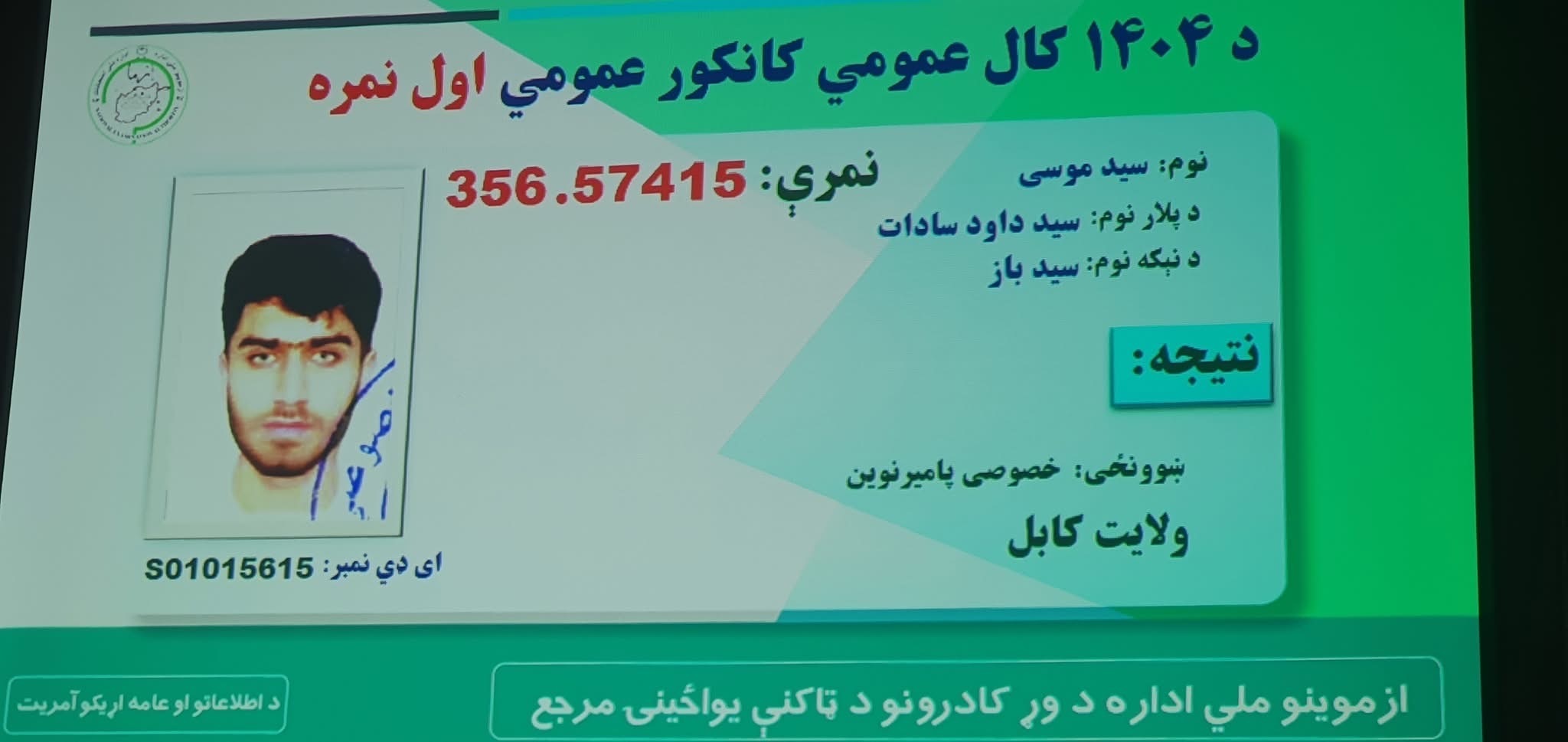 ادارهی ملی امتحانات، نتایج آزمون سرتاسری کانکور سال ۱۴۰۴ خورشیدی را اعلام کرد. در این آزمون، سید موسی فرزند سید داوود از ولایت کابل با کسب ۳۵۶٫۵۷ نمره مقام نخست را به دست آورده است. این دانشآموز از مکتب خصوصی پامیر نوین در شهر کابل فارغالتحصیل شده و اکنون به دانشکده طب دانشگاه کابل راه یافته است.