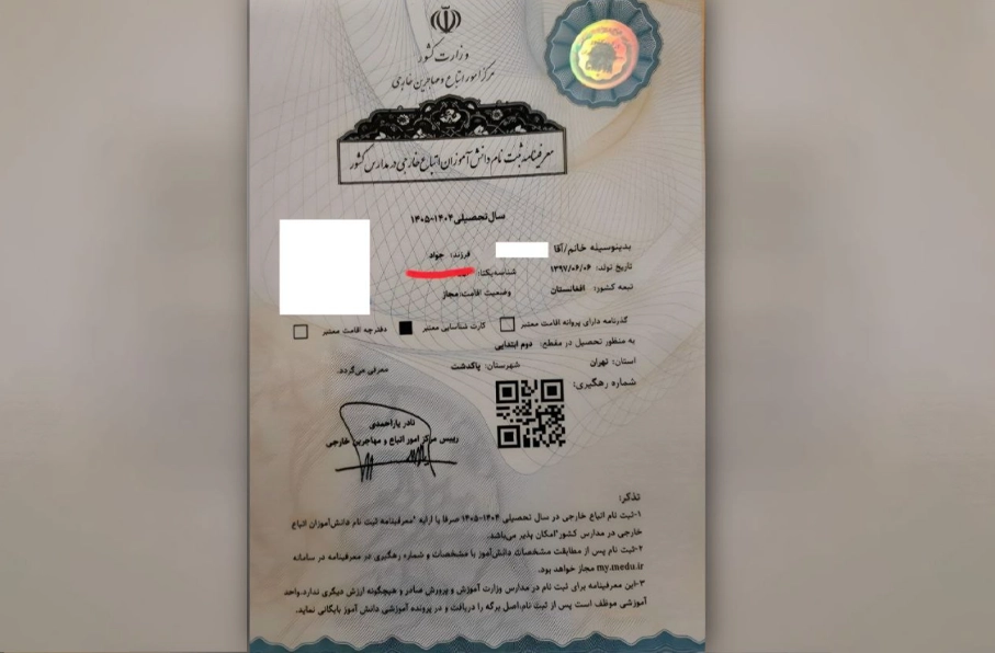 محمد سلیمی، سرپرست مرکز امور بین‌الملل و مکتب‌های خارجی ایران، می‌گوید که دانش‌آموزان «اتباع خارجی» که مهاجران افغانستان را نیز شامل می‌شود، به شرط ارایه‌ معرفی‌نامه‌ای که توسط دفاتر اقامت و اشتغال اتباع خارجی یا مرکز امور اتباع و مهاجران خارجی این کشور صادر می‌شود، می‌توانند در مکتب‌ها ثبت‌نام کنند.
