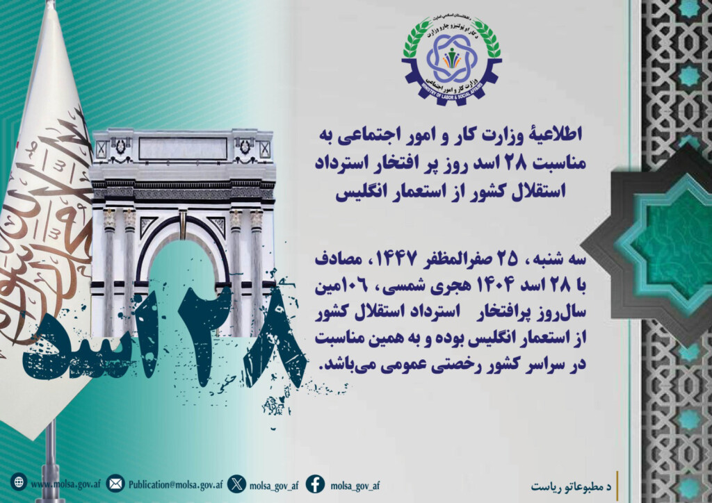وزارت کار و امور اجتماعی طالبان اعلام کرده که روز سهشنبه، ۱۹ اگست، به مناسبت صدمین سالروز استرداد استقلال افغانستان از بریتانیا، در سراسر کشور رخصتی عمومی خواهد بود.