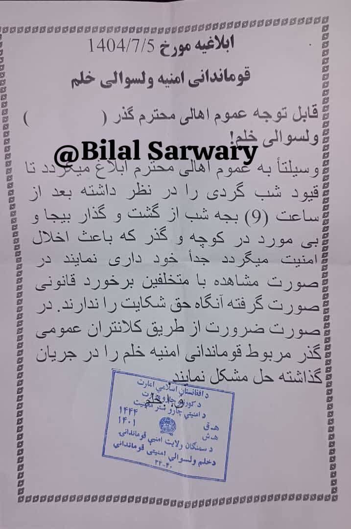 در این اعلامیه که به تازگی منتشر شده، طالبان به ساکنان محل دستور دادهاند که پس از ساعت ۹ شب از گشتوگذار و بیجا حضور در کوچهها خودداری کنند. در اعلامیه تأکید شده که والدین مسئولیت کامل دارند تا فرزندانشان بعد از این ساعت در بیرون از خانه نباشند و در صورت نقض مقرره، برخورد قانونی با متخلفان صورت خواهد گرفت.