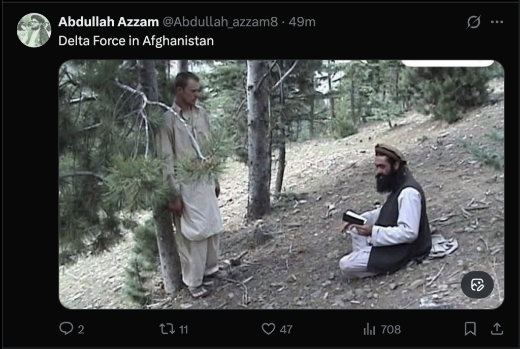 عبدالله عزام، رئیس دفتر غنی برادر، معاون رئیسالوزرای طالبان، با نشر تصویری در شبکههای اجتماعی مدعی شده است که نیروهای ویژه دلتا فورس امریکا در افغانستان موفق نبوده است. در این تصویر، یک سرباز منتسب به واحد دلتا فورس دیده میشود، اما جزئیات دقیق زمان و مکان ثبت آن روشن نیست.