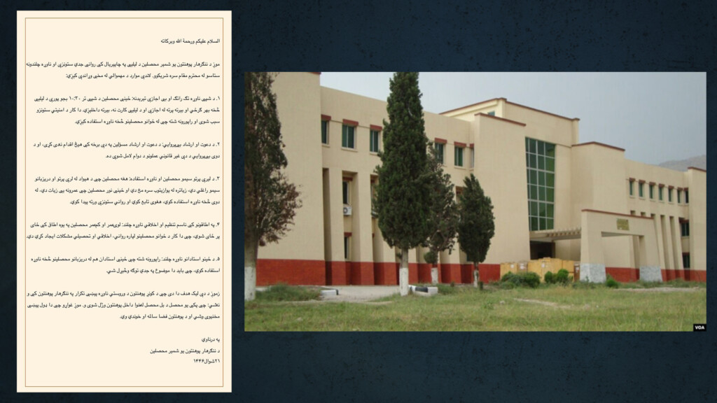 جمعی از محصلان دانشگاه ننگرهار با فرستادن یک نامه رسمی به مقام‌های طالبان و رسانه‌ها از وضعیت نگران‌کننده خوابگاه این دانشگاه پرده برداشته‌اند. آن‌ها می‌گویند که بی‌نظمی، سوءاستفاده، بی‌عدالتی و بی‌تفاوتی اداره‌های مسوول، فضای خوابگاه را برای زندگی و تحصیل محصلان ناامن و پرتنش ساخته است.