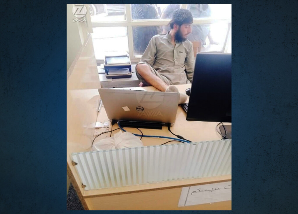 این تصویر مربوط به یکی از اداره‌های دولتی در شهر کابل است. در این تصویر دیده می‌شود، یکی از مأموران طالبان در ساعات کار رسمی، پایش را روی میز گذاشته و بدون توجه به حضور مراجعان، کارش را انجام می‌دهد. مراجعان ادعا دارند که این مأمور طالبان، دفتر رسمی را به مهمان‌خانه شخصی تبدیل کرده و در انجام کارهای روزمره تعلل می‌ورزد.