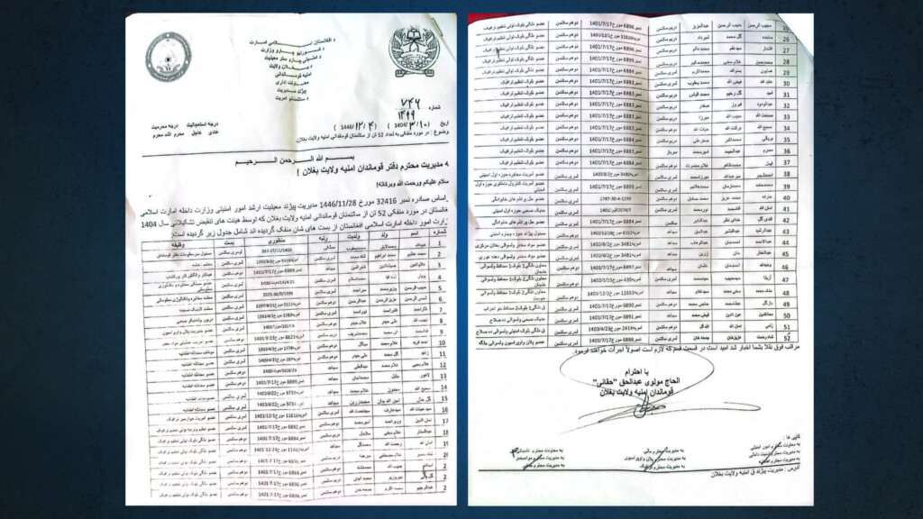 بر اساس اسناد منتشرشده توسط فرماندهی پولیس ولایت بغلان، ۵۴ نفر از منسوبین این نهاد از سوی وزارت داخله طالبان به گونه رسمی برکنار شدهاند. این برکناریها به دستور مستقیم ملاهبتالله، رهبر طالبان صورت گرفته است.